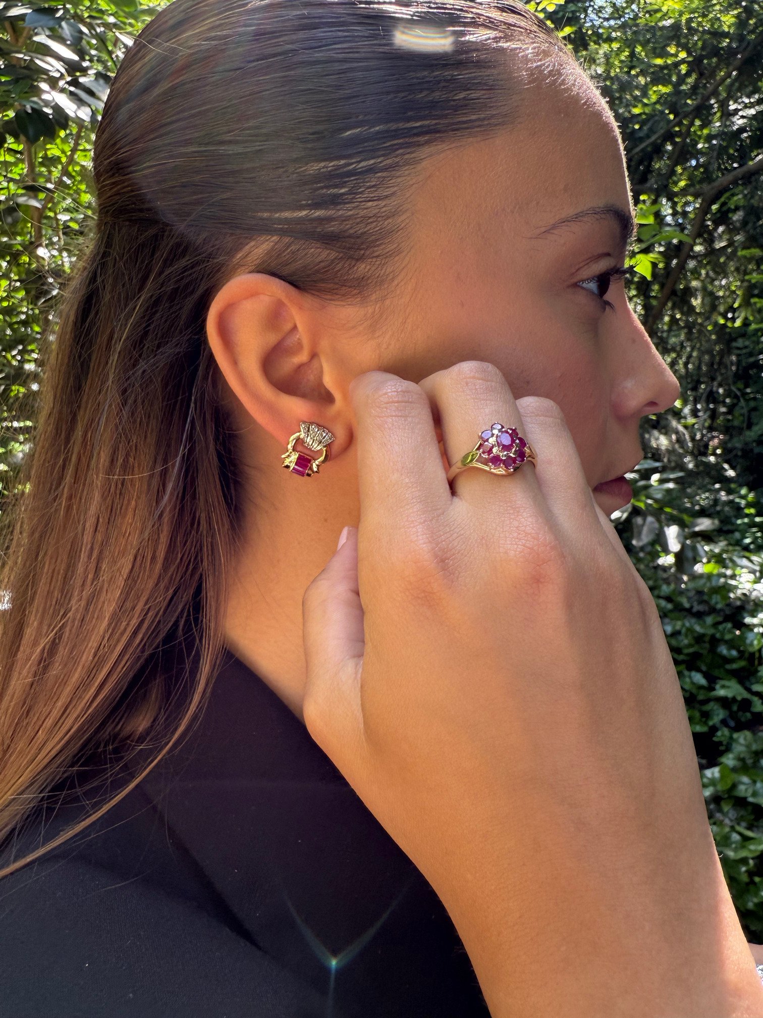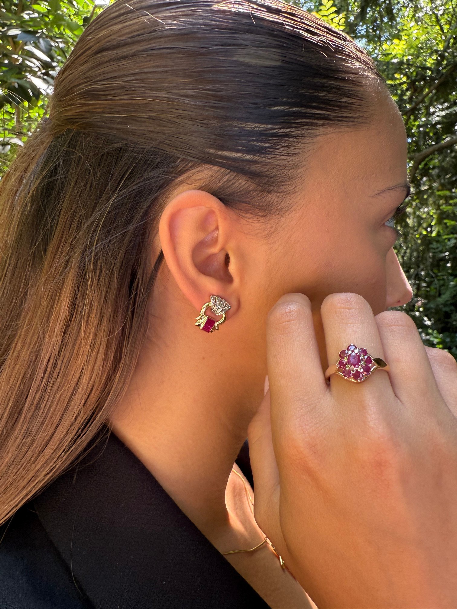 Este anillo vintage está protagonizado por un conjunto de rubíes naturales dispuestos en forma de clúster floral, montados sobre una base de oro amarillo de 18 quilates. Su diseño evoca las joyas de la realeza clásica, con una composición que recuerda a las piezas heredadas generación tras generación.