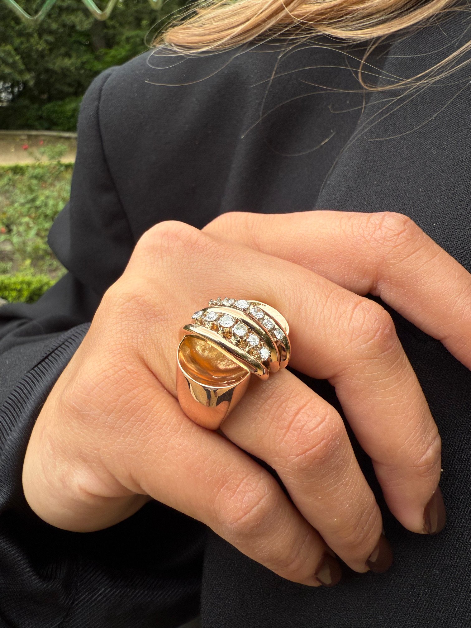 Su diseño escultural lo convierte en un accesorio digno de una colección cápsula de alta joyería.Un anillo cúpula en oro amarillo con diamantes. Atemporal, audaz y deslumbrante.