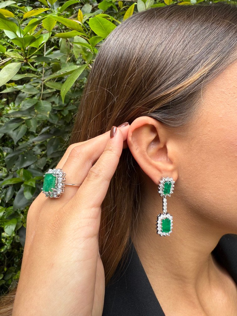 Este anillo vintage está protagonizado por una espectacular esmeralda de talla rectangular, de intenso color verde y gran presencia. Su belleza se realza con un halo de diamantes brillantes que rodean la piedra central, creando un juego de luz y contraste deslumbrante.