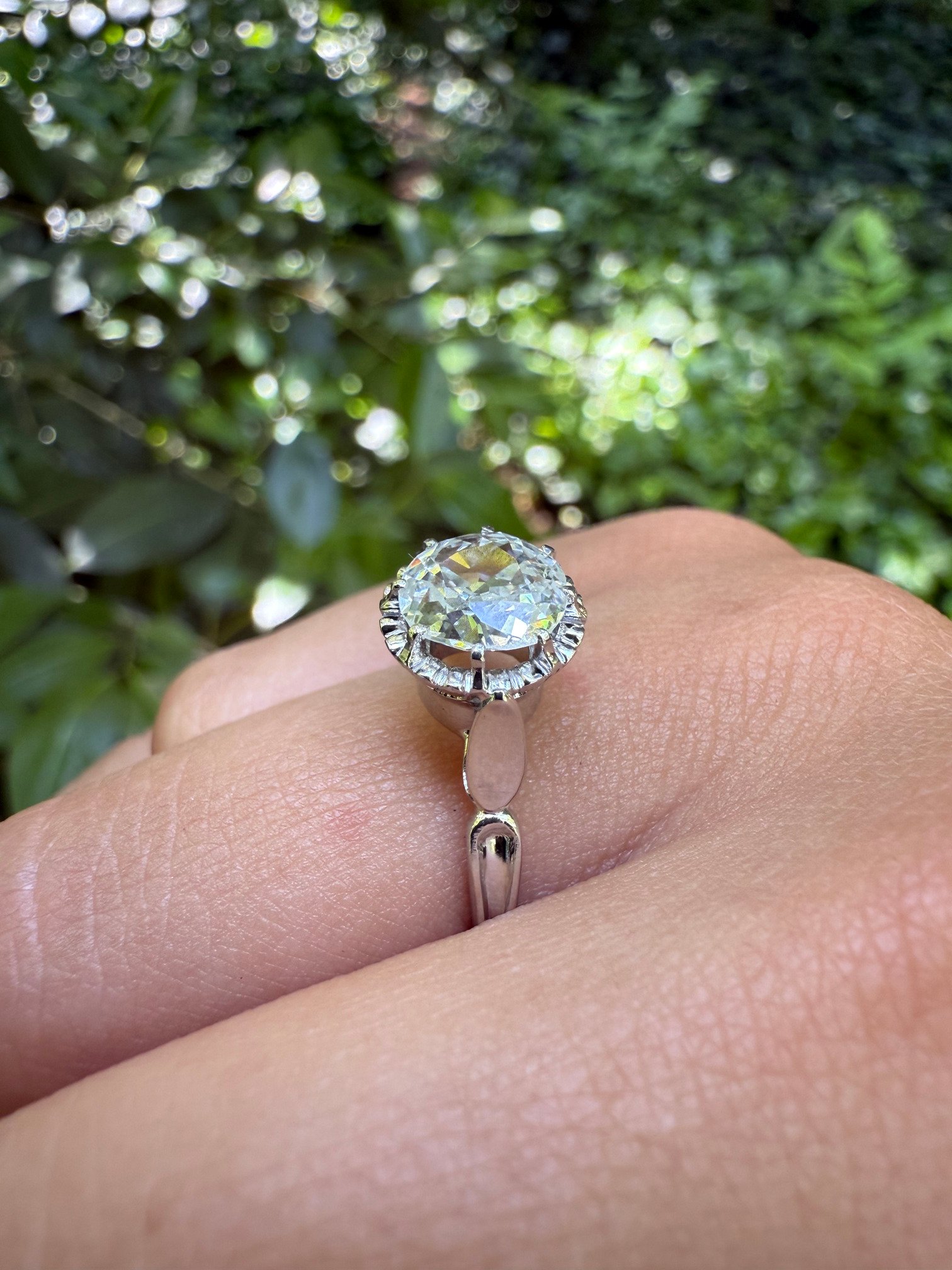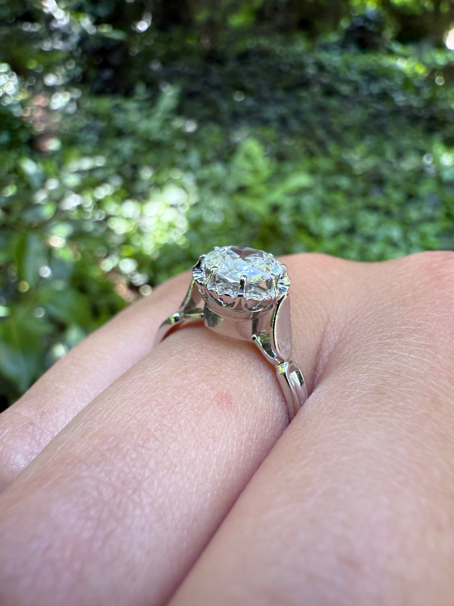 Una joya atemporal que representa la elegancia en su máxima expresión. Su diseño destaca por un espectacular diamante central, rodeado por un delicado halo de diamantes pequeños que potencian aún más su luminosidad y presencia.