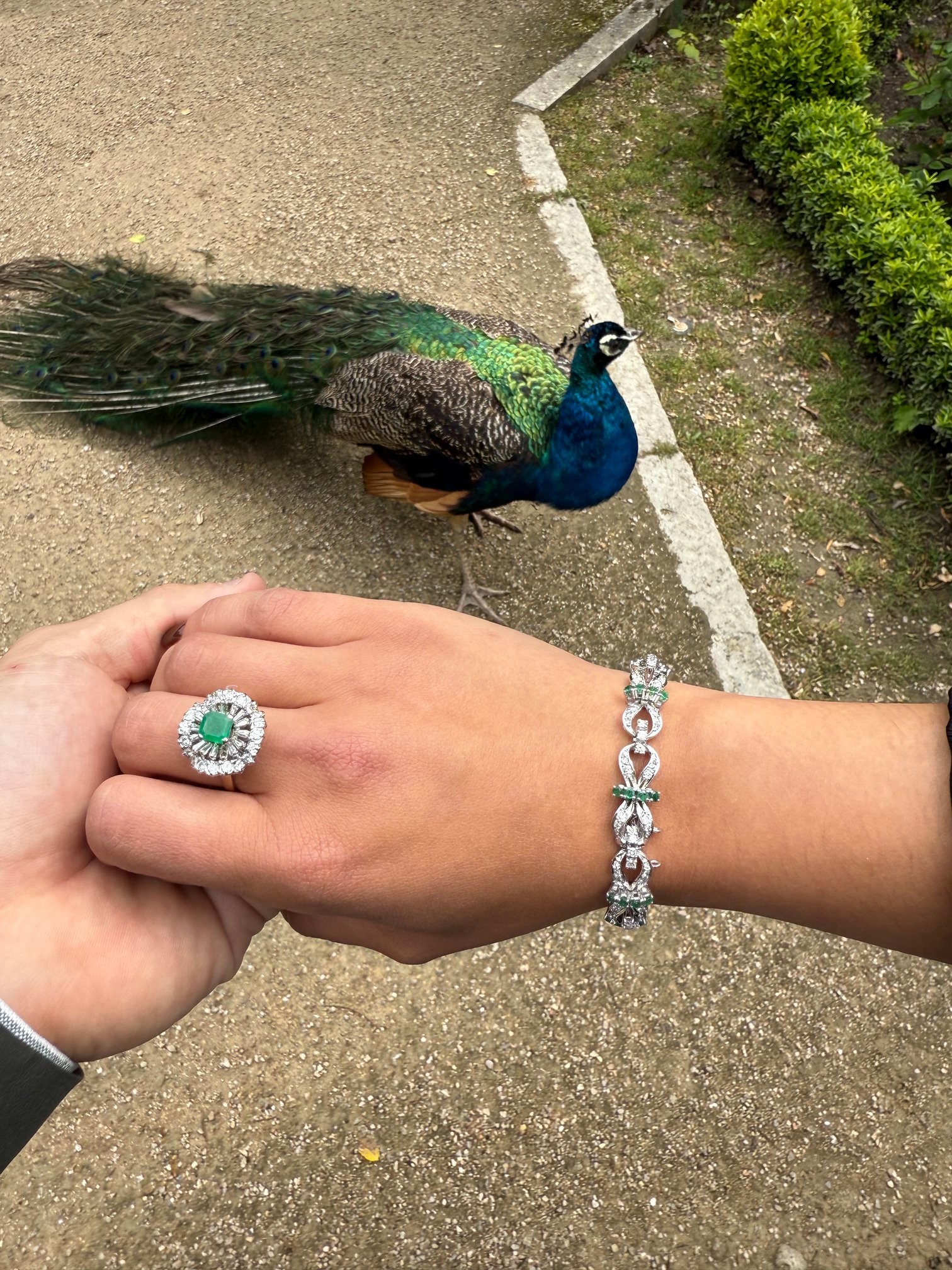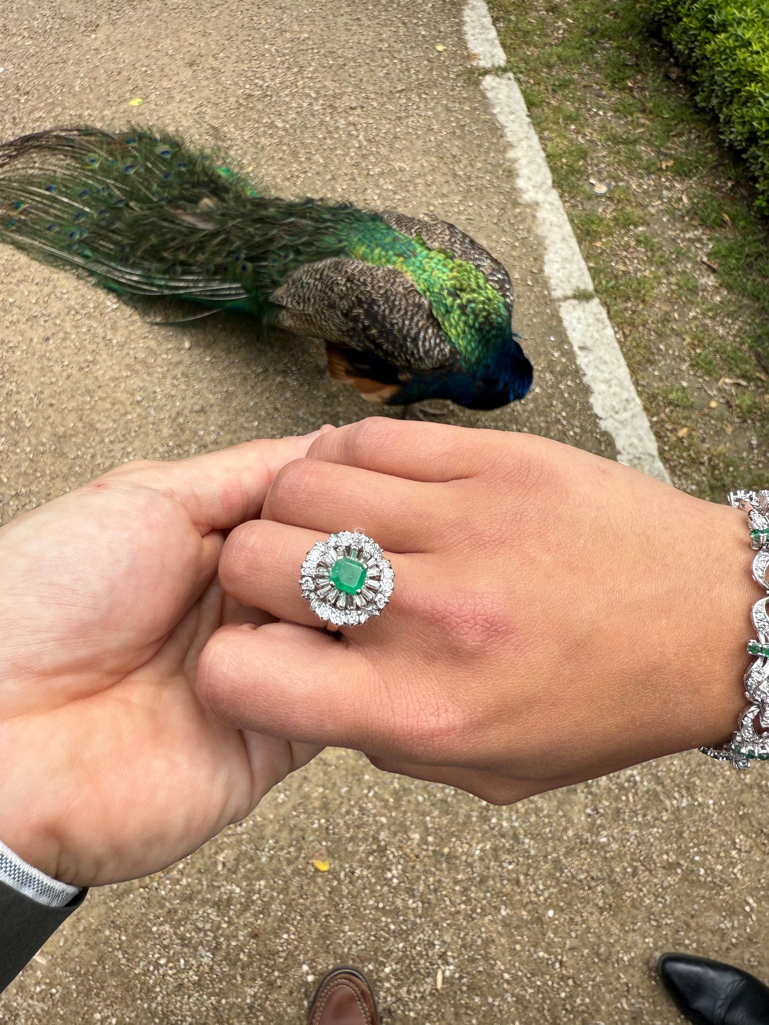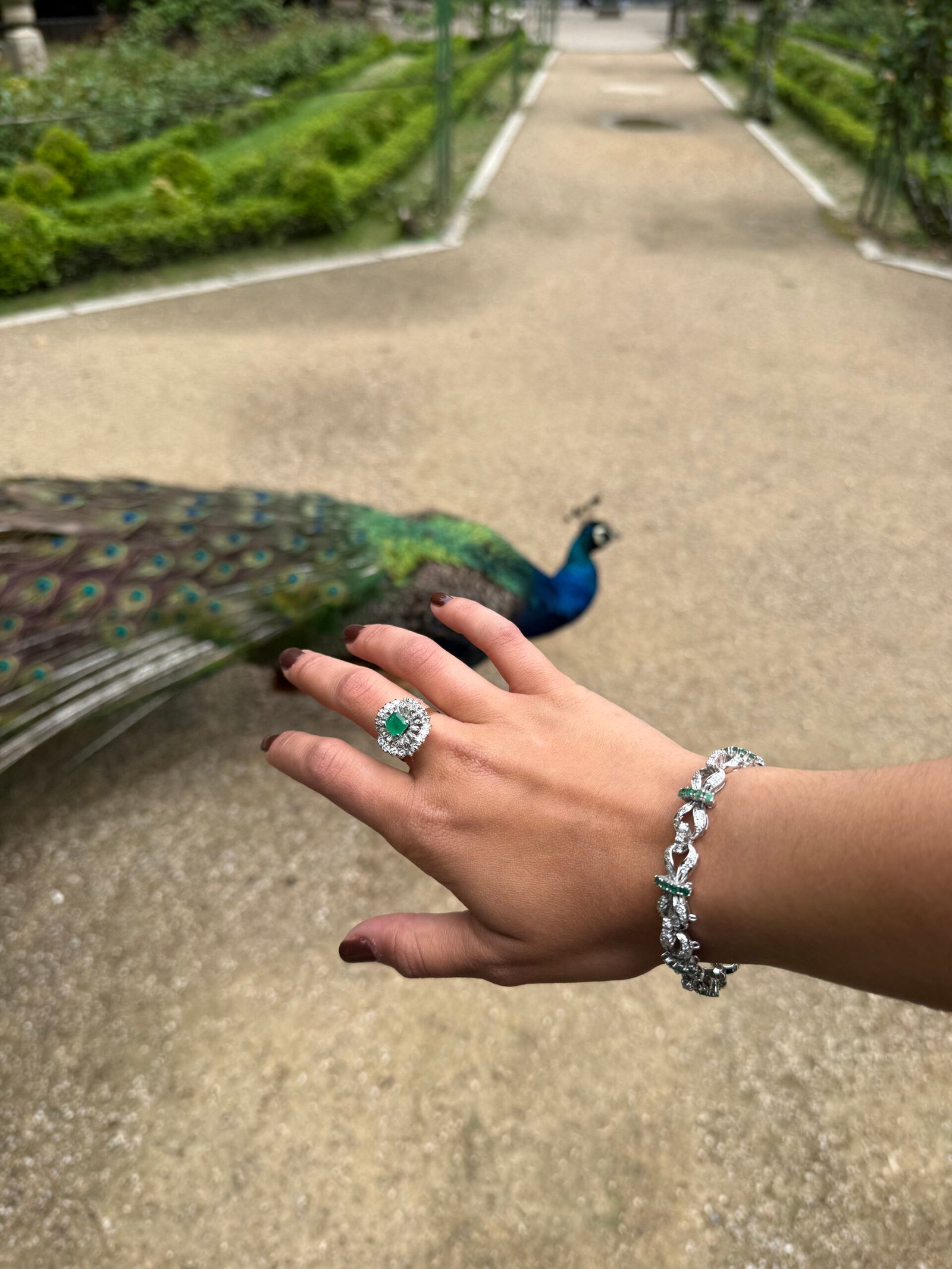 Este espectacular anillo presenta una esmeralda de corte rectangular como protagonista, enmarcada por un doble halo de diamantes: uno de baguettes que aportan estructura y simetría, y otro de diamantes brillantes que le añaden un destello resplandeciente. La montura en oro blanco eleva aún más su sofisticación.