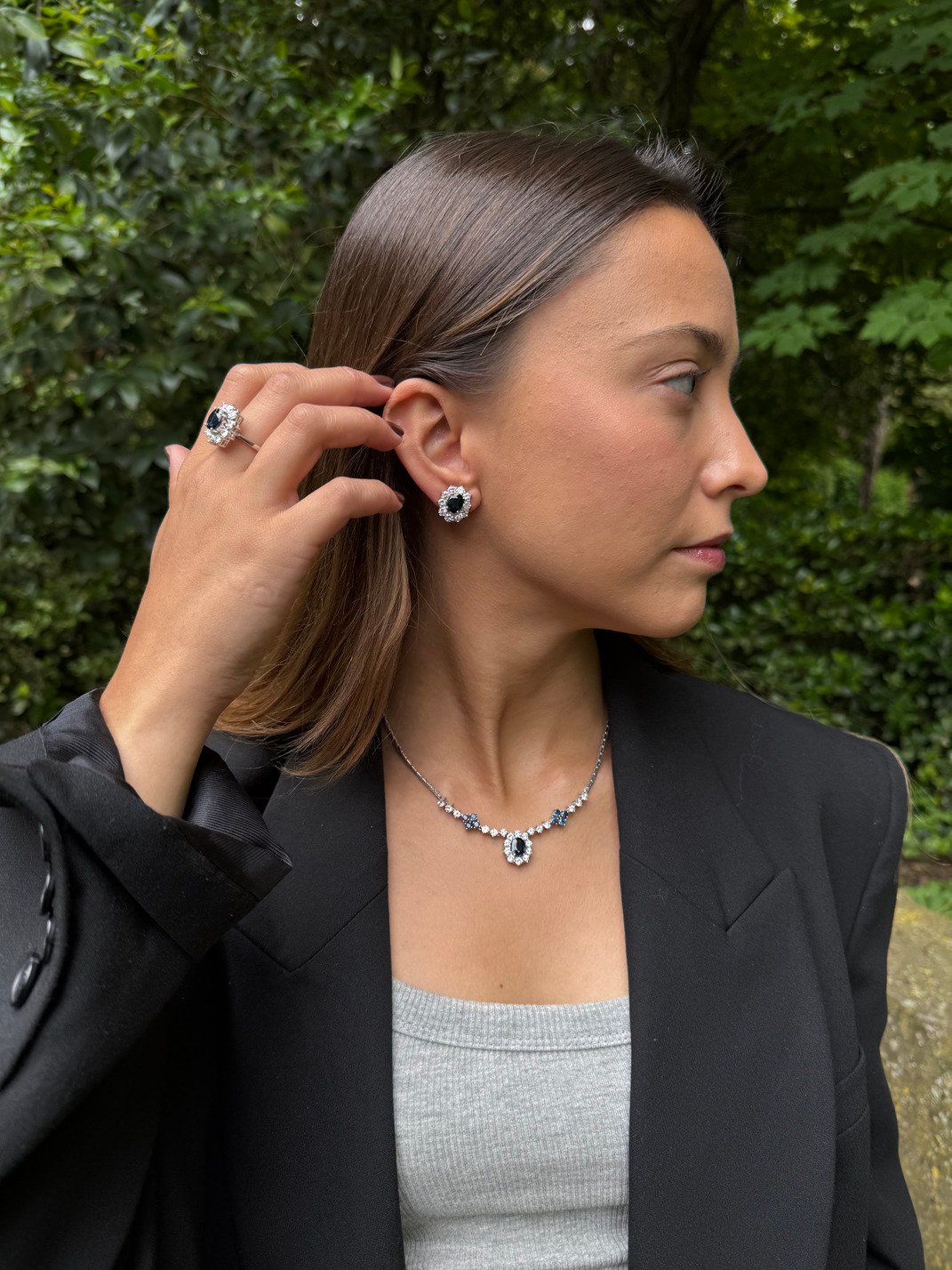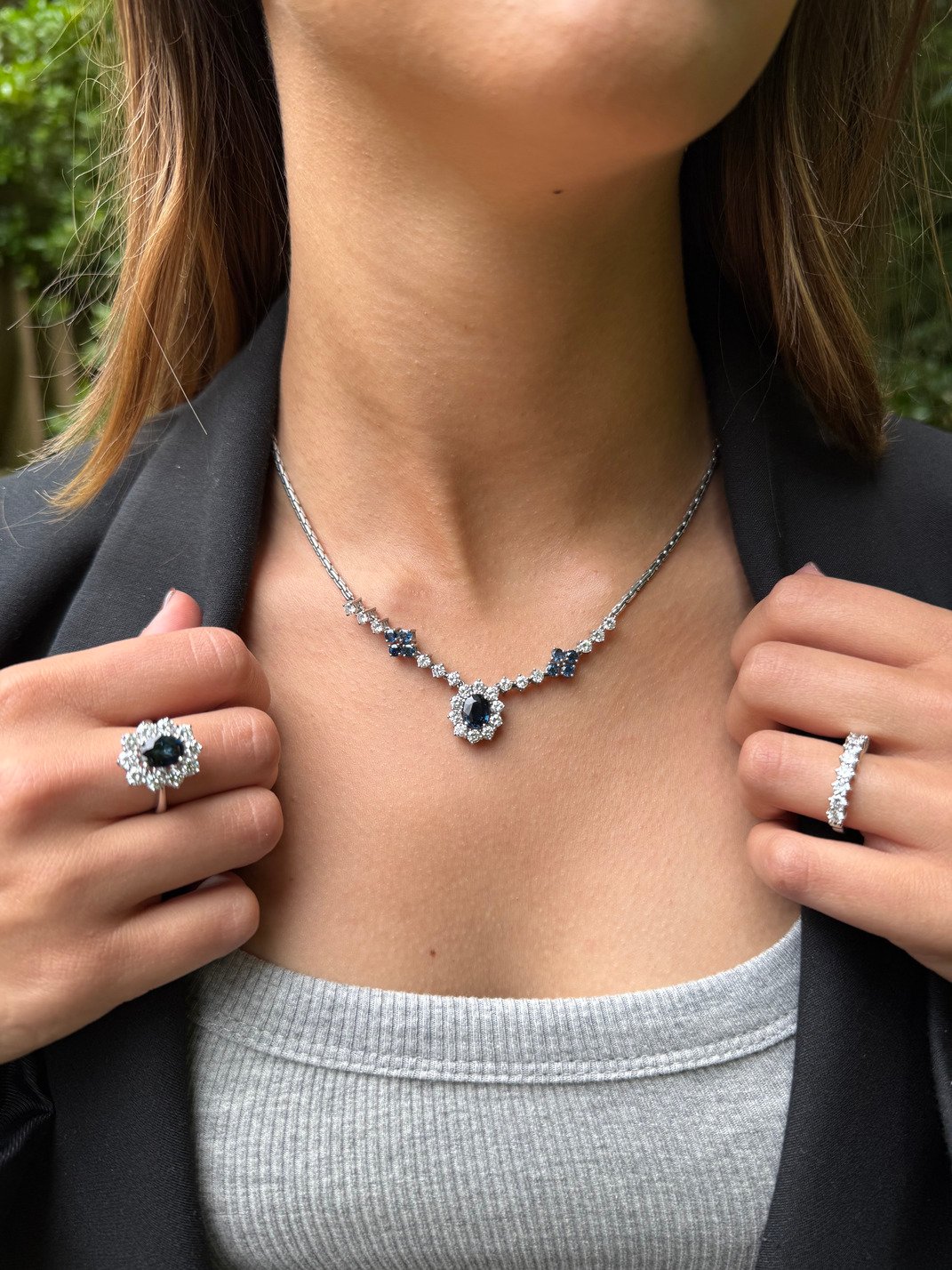 Este collar es una oda al glamour clásico. Inspirado en la joyería de corte real, presenta un diseño halo con centro en azul profundo —simulando un zafiro— rodeado de cristales blancos tallados con precisión.