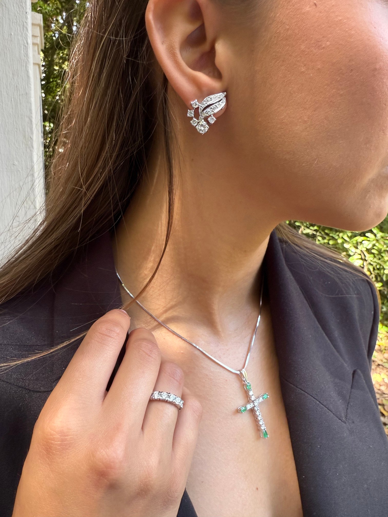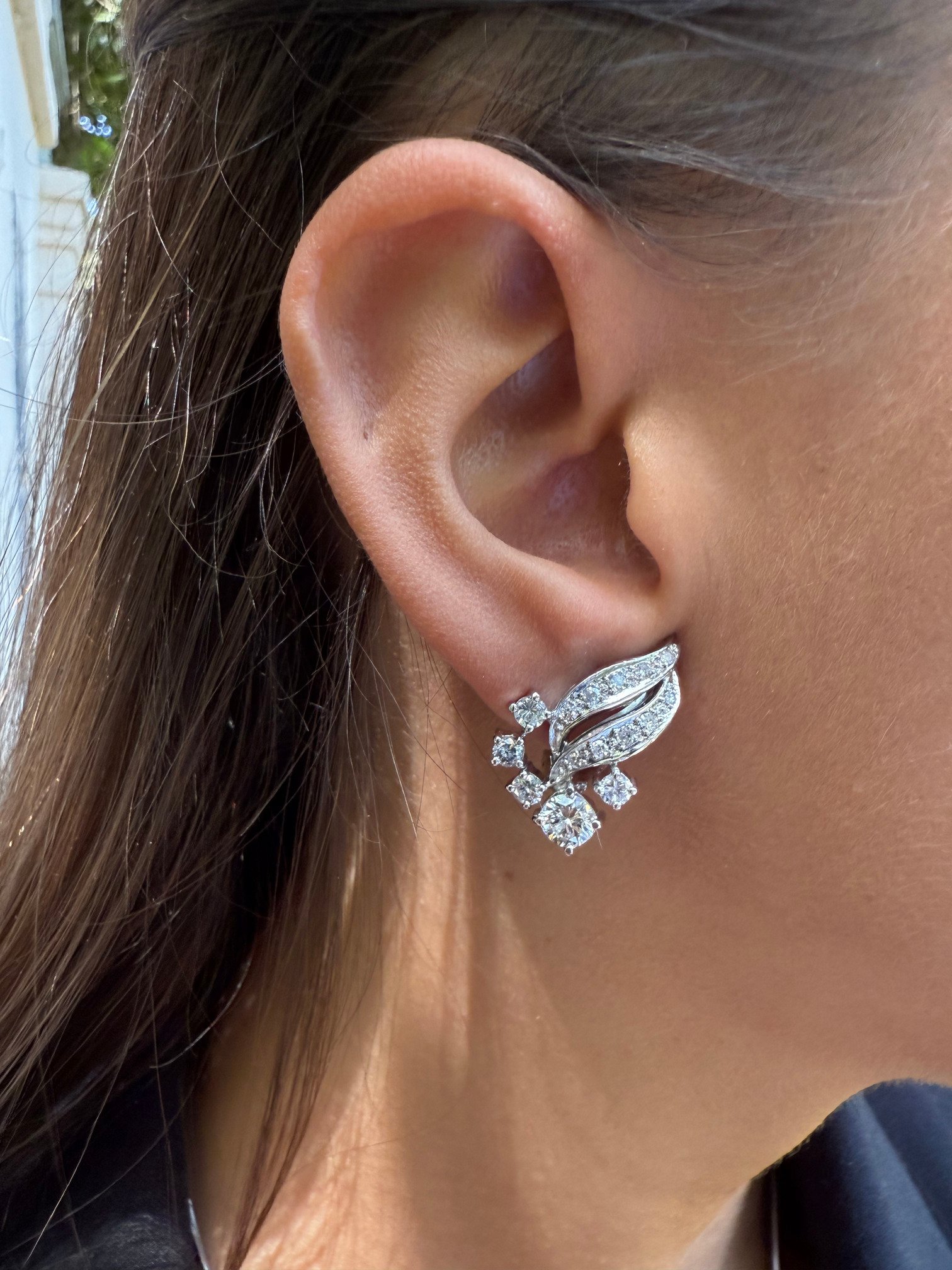 Pendientes en oro blanco con diseño orgánico que evoca la silueta de una hoja o pluma, decorada con múltiples diamantes brillantes de distintas tallas. La pieza combina líneas curvas y detalles geométricos que le otorgan un aire contemporáneo y sofisticado.