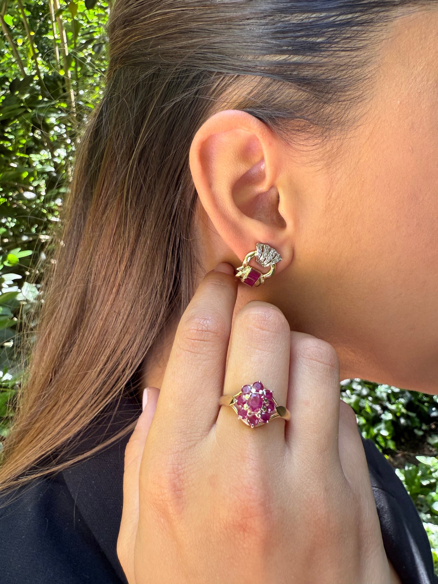 Pendientes en oro amarillo con diseño tipo “buckle” o hebilla, adornados con rubíes en talla baguette y un abanico superior de diamantes engastados. Su estética vintage y sofisticada remite al glamour clásico de las décadas doradas de la joyería, siendo ideales tanto para coleccionistas como para quienes aprecian piezas con carácter.