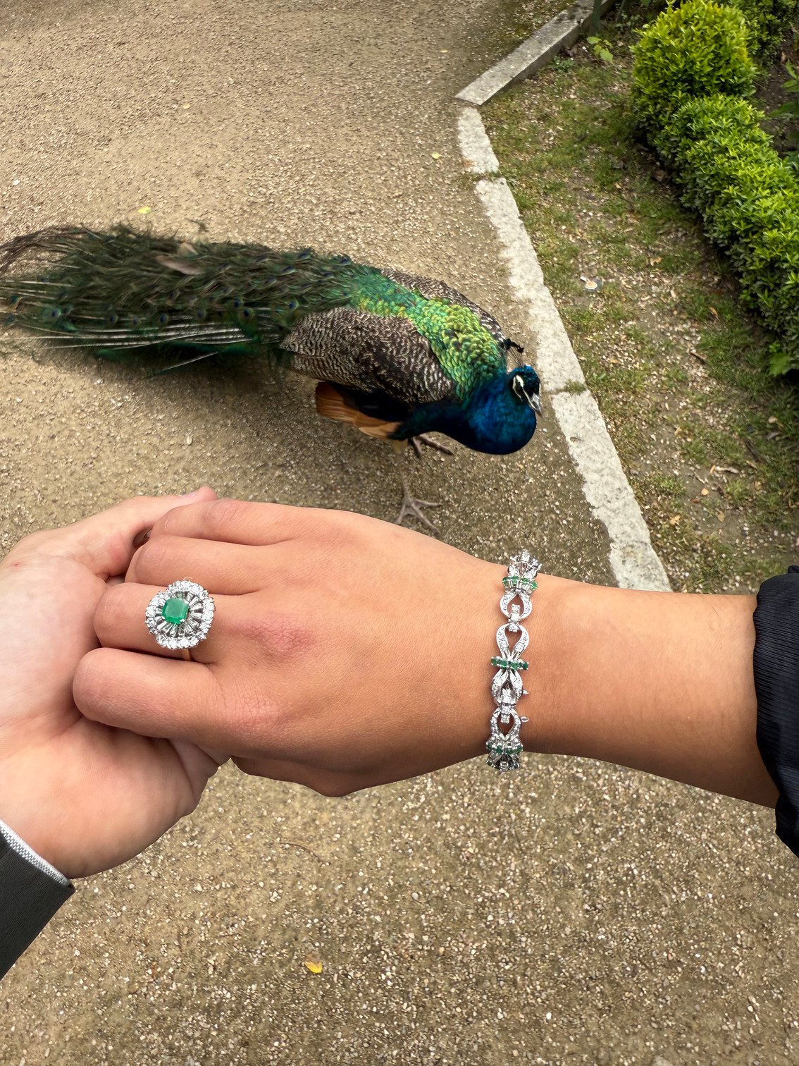 Esta joya exquisita y majestuosa captura la elegancia de los jardines clásicos franceses, combinando el verdor de las esmeraldas con la luz centelleante de los diamantes.